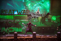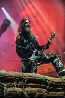 At last it was time for Sabaton to take the stage. After the Apocalyptica show, the stage was rebuild and now resembled a warzone. Trenches were built on stage, there are more fire cannons than you can count and the drumkit was built upon something that resembled an actual tank. Besides their exceptional music, Sabaton brought along the entire arsenal prop and special-effect wise. Pyro, fireworks, a bazooka to shoot the aforementioned tank to bits and so much more, Sabaton truly all out for their ‘Great Tour’. The screen behind the band was used to show the proper imagery at each song, but also aided in storytelling through the show to tie the show together. A few songs in, the singer put on an exterminator outfit including the gas mask and the appropriate tool for the song ‘The Attack of the Dead Men’.
